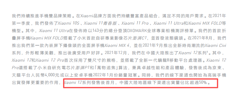 小米的销售结构也同步改变,据2021年小米财报显示,Xiaomi 12系列发售后首月,中国大陆地区线下渠道出货量占比超过50%。