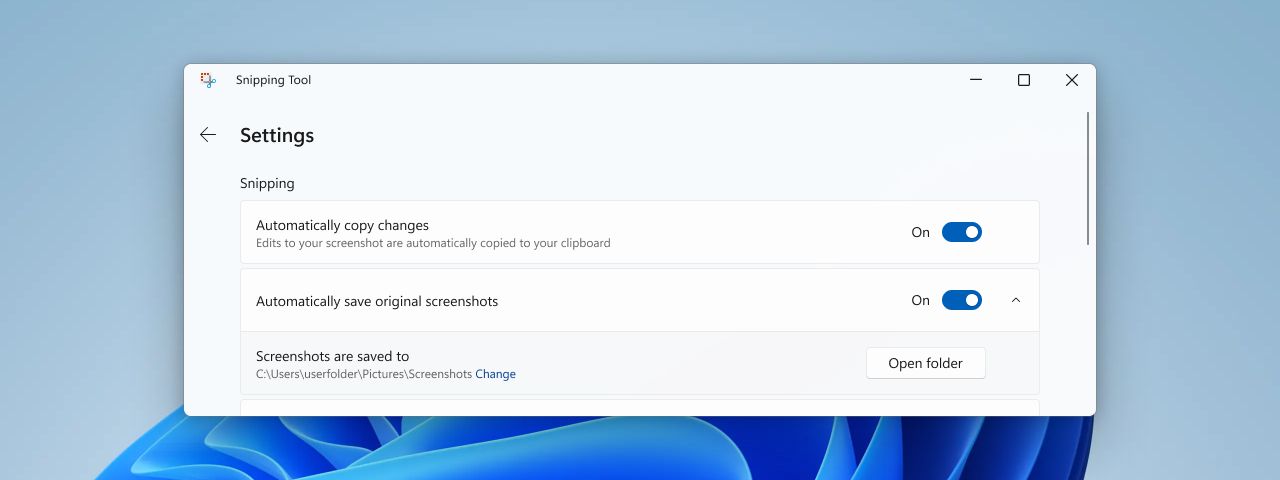 微软面向 Canary 和 Dev 频道的 Windows Insider 项目成员,发布截图工具(Snipping Tool)新版本,用户在 11.2408.13.0 及后续版本中,可以测试了更改原始屏幕截图和屏幕录制自动保存到的文件夹的功能。