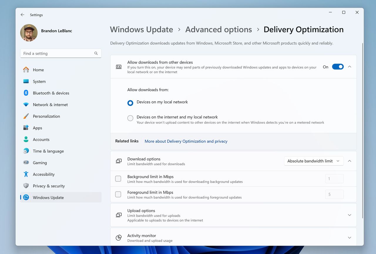 微软设计了“设置”>“Windows 更新”>“高级选项”>“传输优化”下的“传输优化”设置页面,以符合 Windows 11 的设计原则。