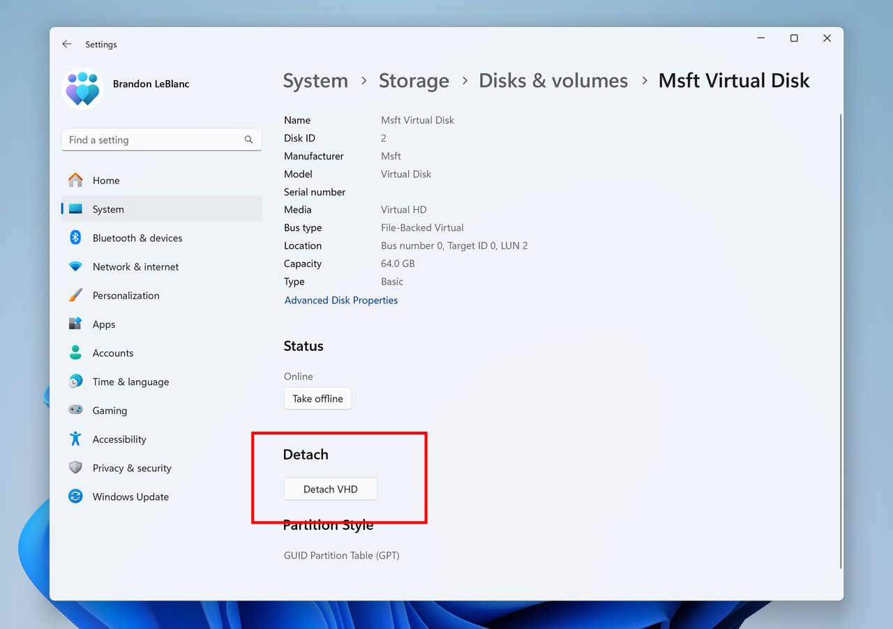 根据反馈意见,微软在“设置”中添加了分离虚拟硬盘 (VHD/`VHDx) 按钮,使根据需要分离 VHD / VHDx 变得更加简单。在 VHD / VHDx 属性中的“设置”>“系统”>“存储”>“磁盘和卷”下可以使用该选项。