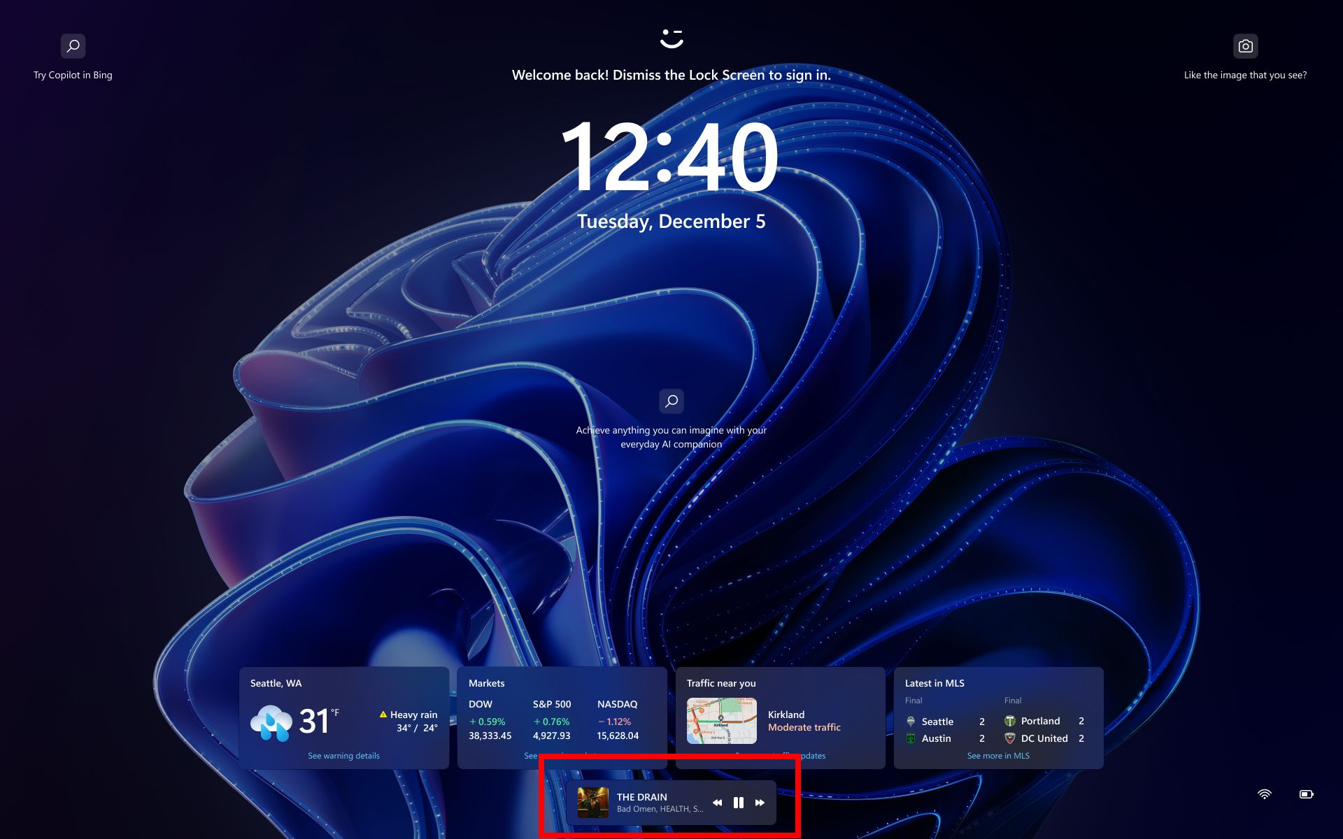 微软调整锁定屏幕,现在播放媒体时,媒体控制按钮将显示在锁定屏幕的底部中央。