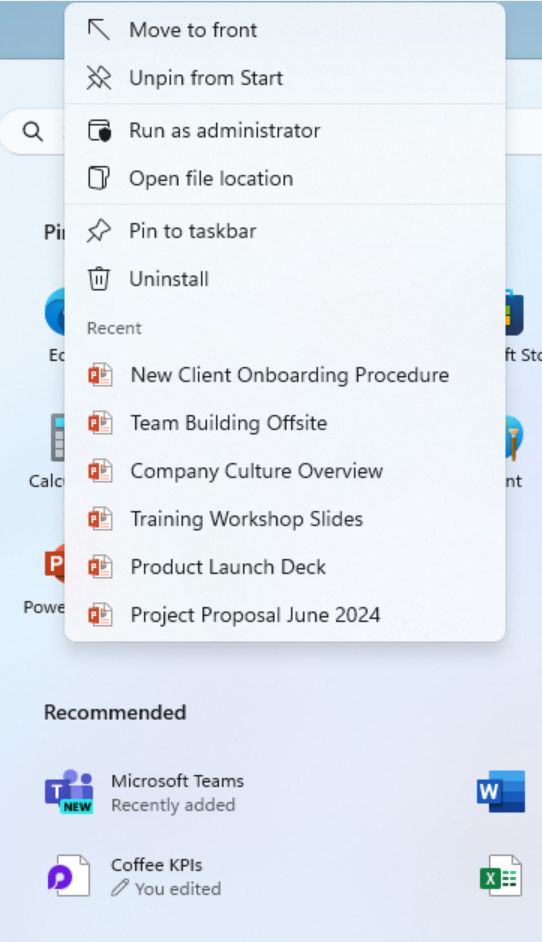 右键单击固定在开始菜单上的 PowerPoint 等应用程序时,将显示应用程序的 jump lists。