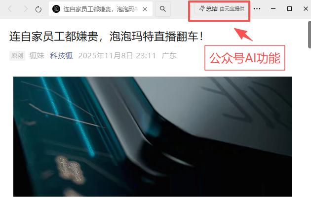 当你在 PC 端打开一篇公众号文章时,可能会在右上角发现一个新增的“总结”按钮,旁边还标注着“由元宝提供”。