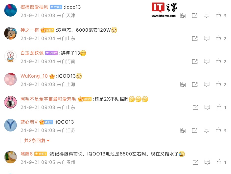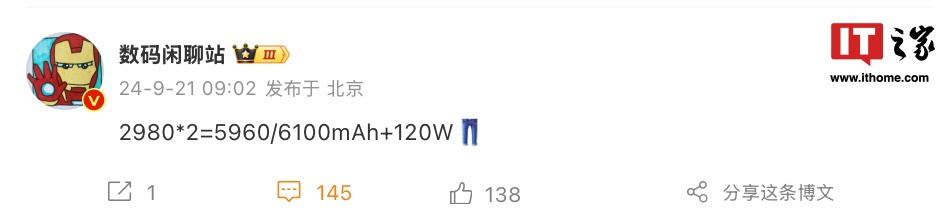 IT之家 9 月 21 日消息,博主 @数码闲聊站 今天透露一款神秘新机将配备 6100 毫安时电池,使用双电芯,支持 120W 快速充电技术,参考评论区,这款手机有望为 iQOO 13。
