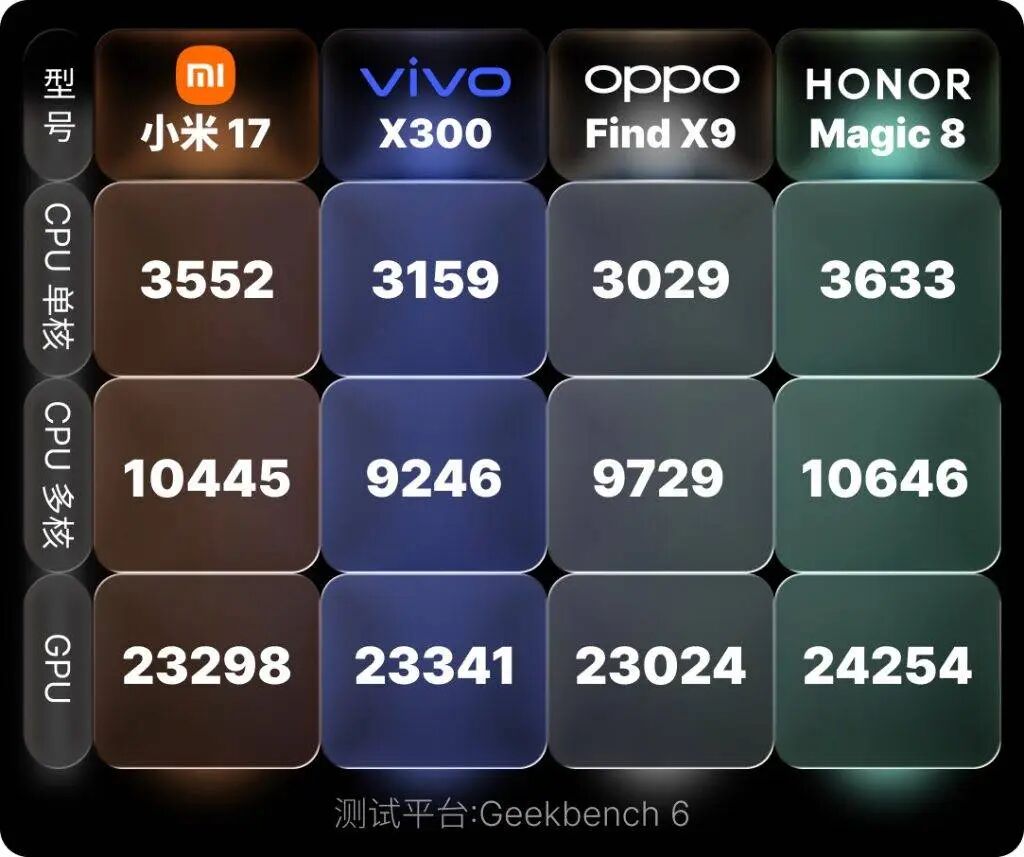 小米 17 和荣耀 Magic 8 采用了高通骁龙 8 Elite Gen 5 处理器,而 OPPO Find X9 和 vivo X300 依旧选择联发科阵营,搭载天玑 9500 处理器。