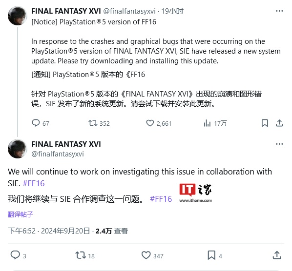 《最终幻想 XVI》官方 X 账号昨日(9 月 20 日)发布推文,表示索尼已发布新的系统更新,修复了 PS5 版《最终幻想 XVI》运行时出现的崩溃和图形错误,双方目前仍在调查上次更新(24.06-10.00.00)导致游戏无法正常运行的原因。
