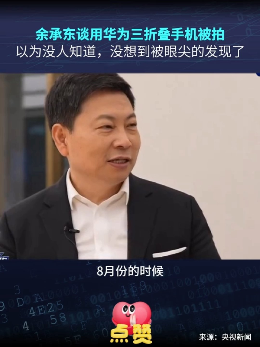 尼格买提说:“8 月份就有人拍到您在飞机上拿了这台手机了,特别的低调也特别的凡尔赛。”余承东则回复道:“我们有信息安全,泄密还被罚款呢!因为我一想到当时展开的应该是‘平板’,也没想到眼尖的人可能会怀疑,平板没有这么薄,会看出来可能是华为的三折叠手机。”