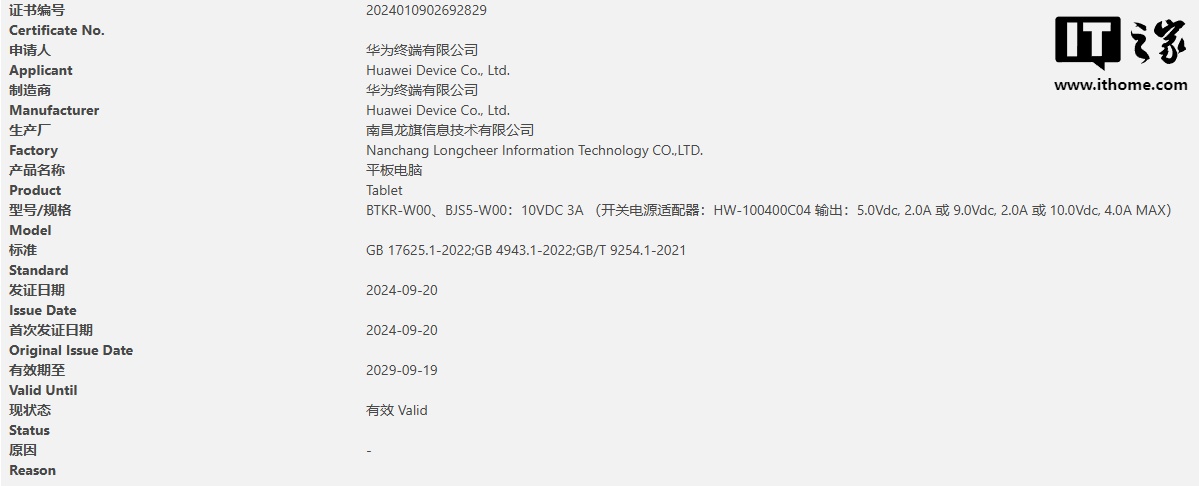 IT之家 9 月 21 日消息,华为昨天有两款平板电脑新品通过了 3C 认证,型号为 BTKR-W00、BJS5-W00,附赠 HW-100400C04 充电器,支持 40W 快充。