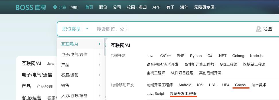 经过15年的发展,Cocos在全球积累了超过170万注册开发者,覆盖设备超过16亿,已经是最成功的国产通用游戏引擎了。打开招聘网站首页的分类,你会发现在互联网技术岗位里,Cocos与鸿蒙是唯二能被直接列入「职业岗位名称」的国产技术栈;