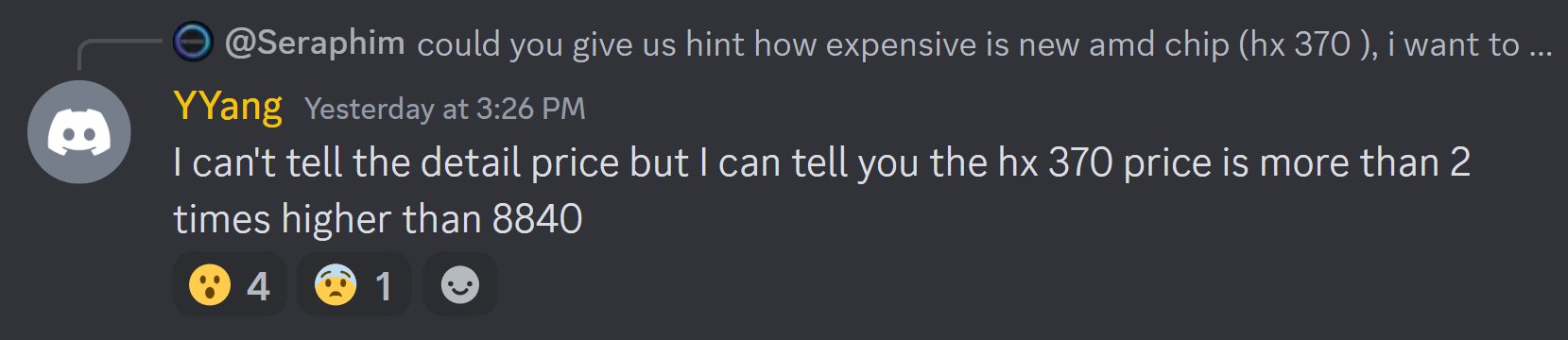 一位 GPD 员工在 Discord 上谈到了 AMD Ryzen AI 9 HX 370 处理器的 OEM 定价,他虽然没有给出具体数字,但表示这款处理器的价格相当于两倍的 Ryzen 7 8840U,这也解释了为何 HX 370 新机价格普遍偏贵。
