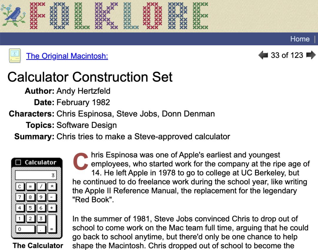 这个故事后来被另一位苹果工程师 Andy Hertzfeld 记录在他的网站 Folklore.org 上(https://www.folklore.org/Calculator_Construction_Set.html),也由外媒 Arstechnica 披露出来,让众人了解到了这家科技巨头曾在软件设计、研发维度的一些趣事。