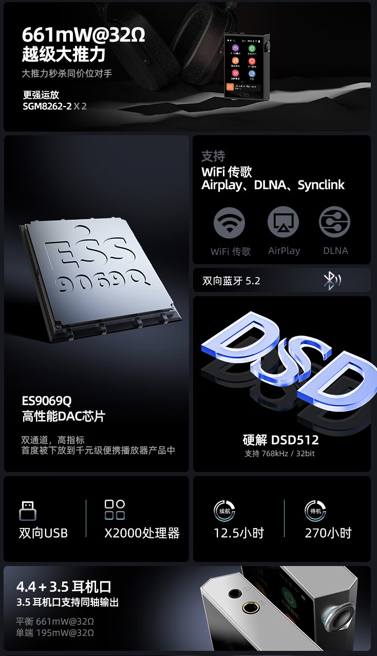 规格方面,官方称山灵 M1 Plus 为“推力战神”,其号称“首度在千元级播放器品类搭载了高阶的 ES9069Q DAC、双 SGM8262 运放”,可提供高达 661mW@32Ω 的推力。同时,M1 Plus 搭载蓝牙 5.2 技术(支持 LDAC / aptx HD 音频传输技术),内置 2100 毫安时电池,最长续航高达 12.5 小时。