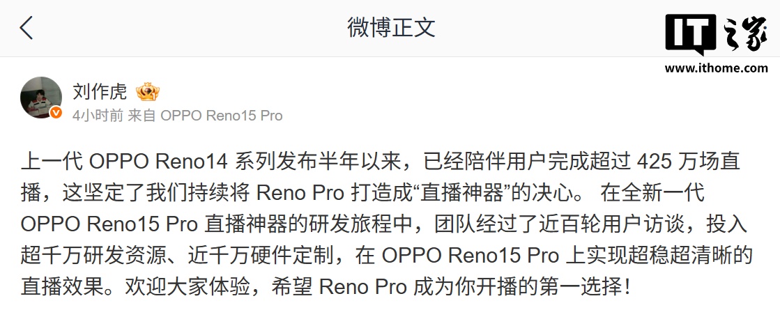 IT之家 11 月 13 日消息,OPPO 首席产品官兼一加创始人刘作虎今天在微博发文称,上一代 Reno 14 系列发布半年以来,已陪伴用户完成超 425 万场直播,坚定他们继续将 Reno Pro 手机打造成“直播神器”的决心。