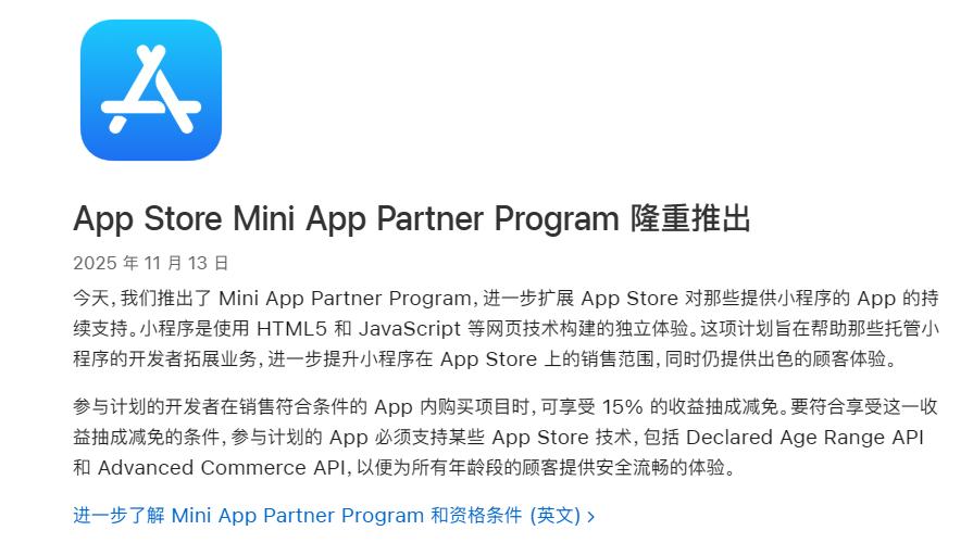 本计划专为托管小程序和小游戏的开发者设计。这些小程序和小游戏使用 HTML5 或 JavaScript 等 Web 技术构建。参与的 App 需要支持特定的 App Store 技术,包括“声明的年龄范围 API”和“高级商务 API”,以便为客户提供安全、无缝的体验。因此,计划成员可以从符合条件的小程序内 App 内购买的销售额中获得 85% 的分成。