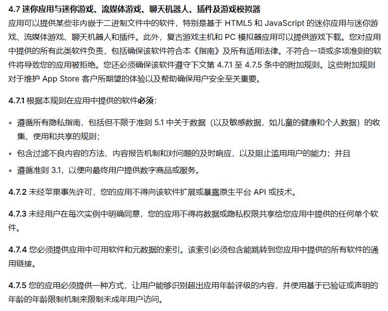 据苹果官方消息介绍,参与“小程序合作伙伴计划”需满足多项技术与合规要求。比如必须支持 iOS 和 iPadOS 系统,并在 App Store 上架。同时,所有托管小程序需遵守《开发者计划许可协议》和《应用审核指南》,特别是第 4.7 条关于小程序、小游戏等特定要求。开发者需提供经苹果审核的配置文件,包含小程序的元数据。