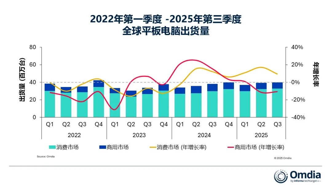 11月7日,市场研究机构Omdia发布最新报告显示,2025年第三季度全球平板电脑出货量达到4000万台,同比增长5%,实现连续第七个季度正增长。报告指出,中东和中欧地区需求强劲,中国消费者购买力持续释放,为全球市场提供了关键支撑。