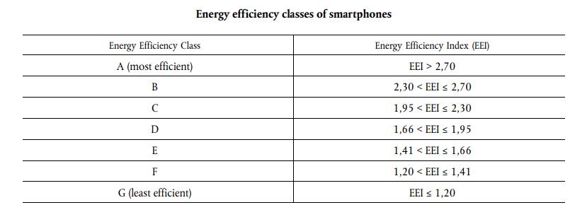 老狐也查了能效等级怎么划分,以智能手机为例,根据能效指数(EEI)的大小,可以划分为 A、B、C、D、E、F、G 七个等级。