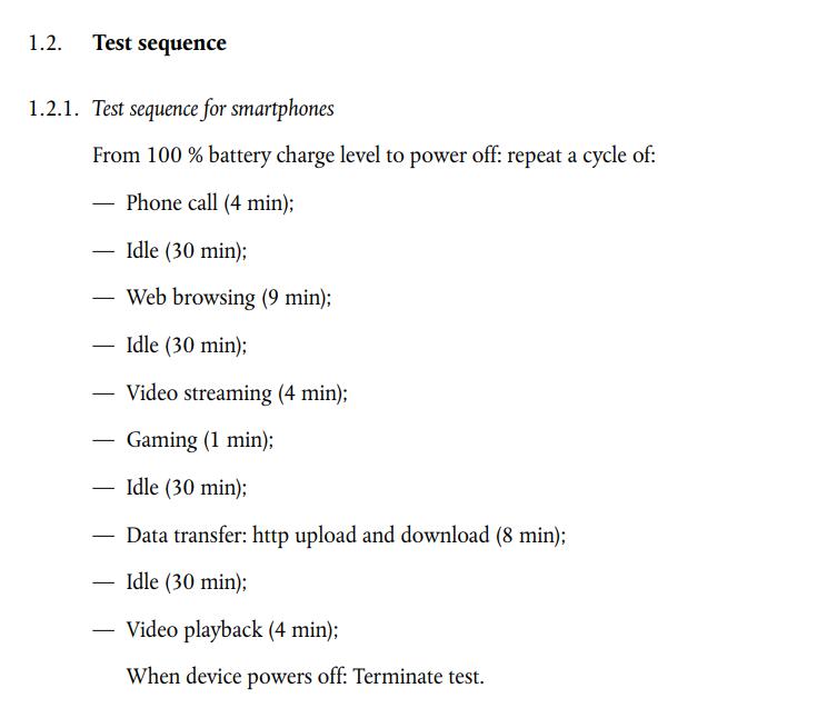 测试方法是通话 4 分钟、待机 30 分钟、网页浏览 9 分钟、待机 30 分钟、视频流媒体 4 分钟、游戏 1 分钟、待机 30 分钟、数据传输 8 分钟、待机 30 分钟、视频播放 4 分钟……