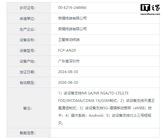 根据入网信息,该设备支持“天通卫星通信制式”、“北斗三号短报文”。