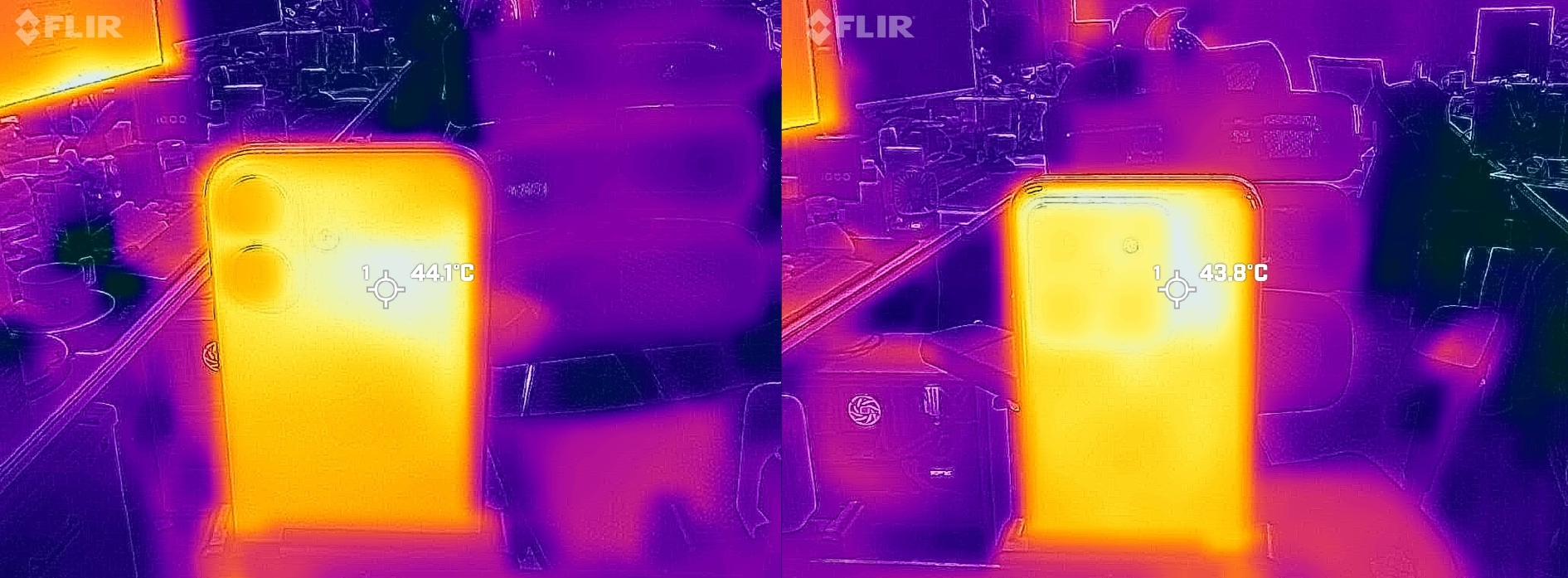 可见温度差距还是较为明显的,实际上手时能明显感觉到iPhone 16的上半部分发烫,而小米14只是感觉温热。