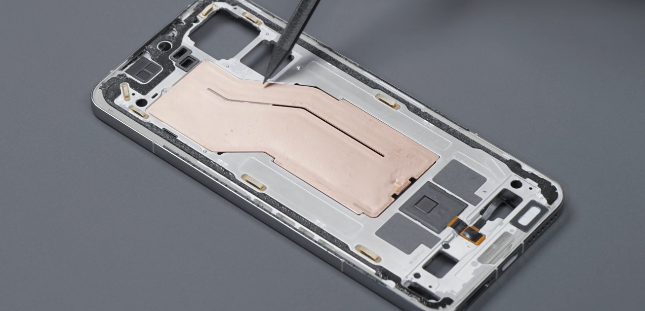 简单来说,就是用一个新设计的金属屏蔽罩覆盖芯片,然后通过导热贴将热量传递到金属中框,通过金属中框将热量引导到外界。这样设计的好处是不需要对内部结构进行大量的改动,就可以有效提升散热效率。