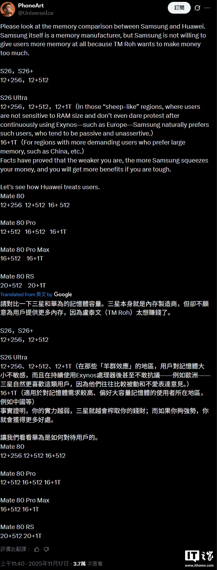 博主还吐槽道,三星本身就生产内存,却不愿意给用户提供更大的内存,卢泰文(三星电子移动体验部门负责人)实在是太想赚钱了。而且这种“区别对待”表明,你的实力越弱小,三星就会想方法榨取(squeezes)你的钱财;但如果你足够强势,那就会获得更多好处。
