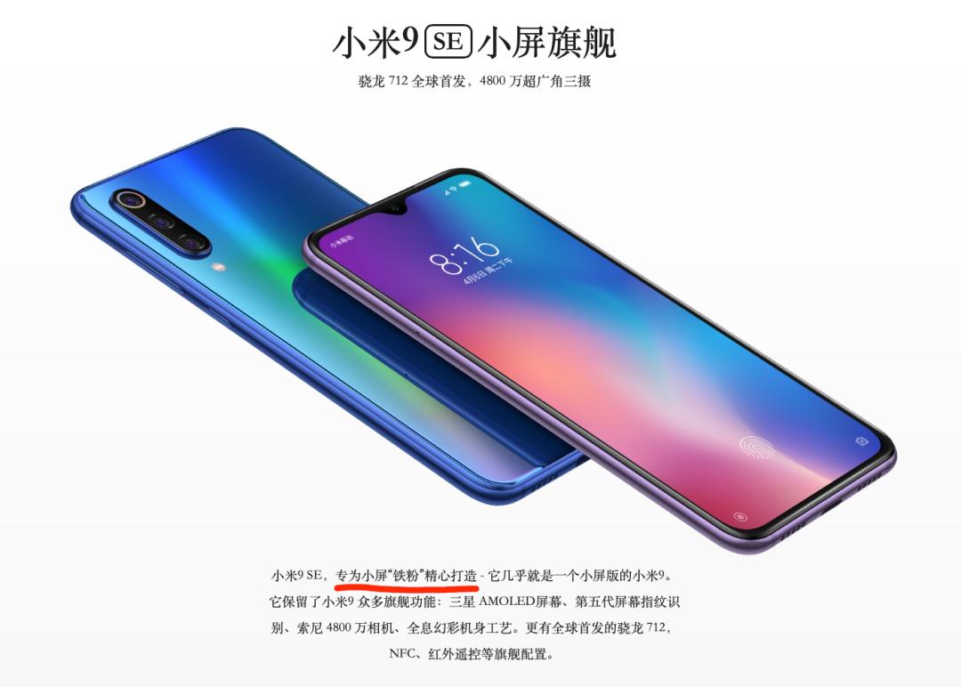 然后下一代的小米 9 SE 甚至在详情页直接标注【专为小屏“铁粉”打造】,可见小米对这个细分市场的重视程度。