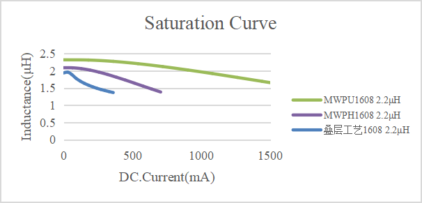 相同的尺寸和感量下,以尺寸1608,感量2.2/4.7/10μH为例,MWPU系列饱和电流相较于MWPH系列提高了12%以上,且MWPU1608A合金系列饱和电流高出2倍以上。
