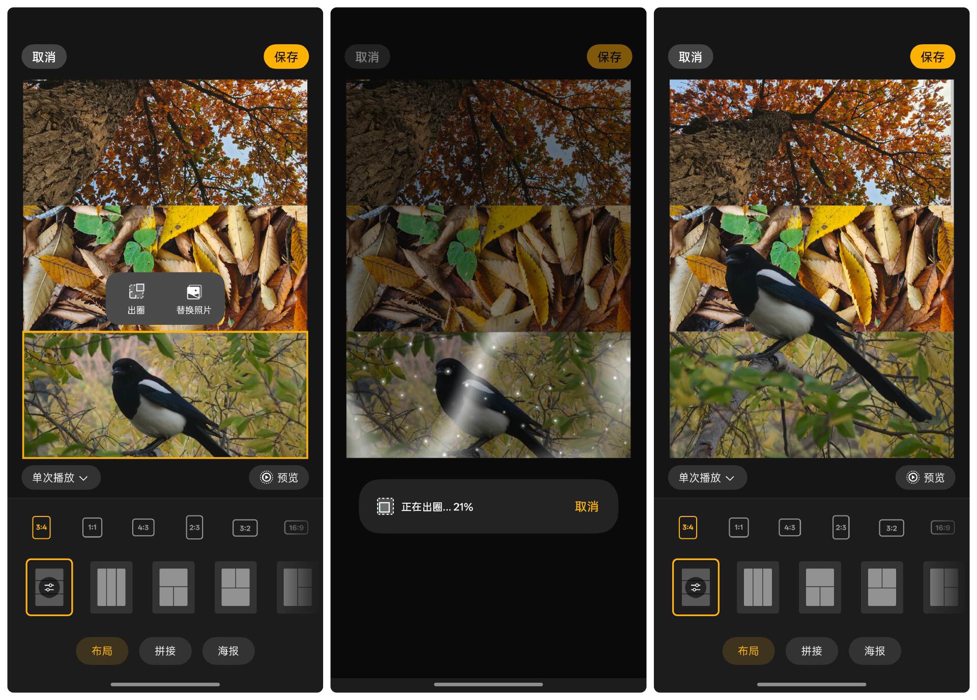 如上图所示,在相册中选中三张实况图进行拼图,只需轻触画面主体,点击“出圈”,通过成熟的视频抠图技术,AI 可以智能识别动态的人物主体,并放大其肢体动作和饱满的情绪。