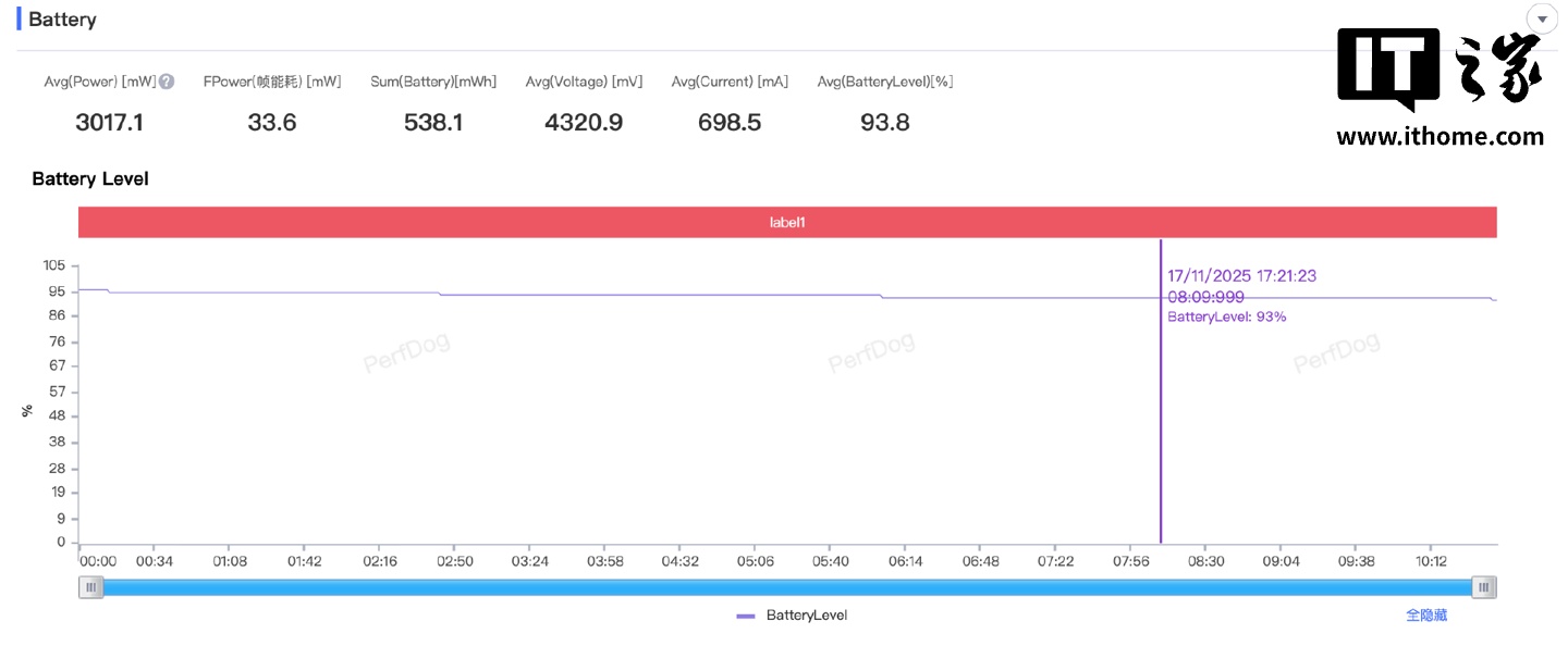 另外,天玑 8450 芯片的功耗控制也非常不错,最高画质最高帧率《王者荣耀》游戏中,Reno15 整机功耗仅为 3W。