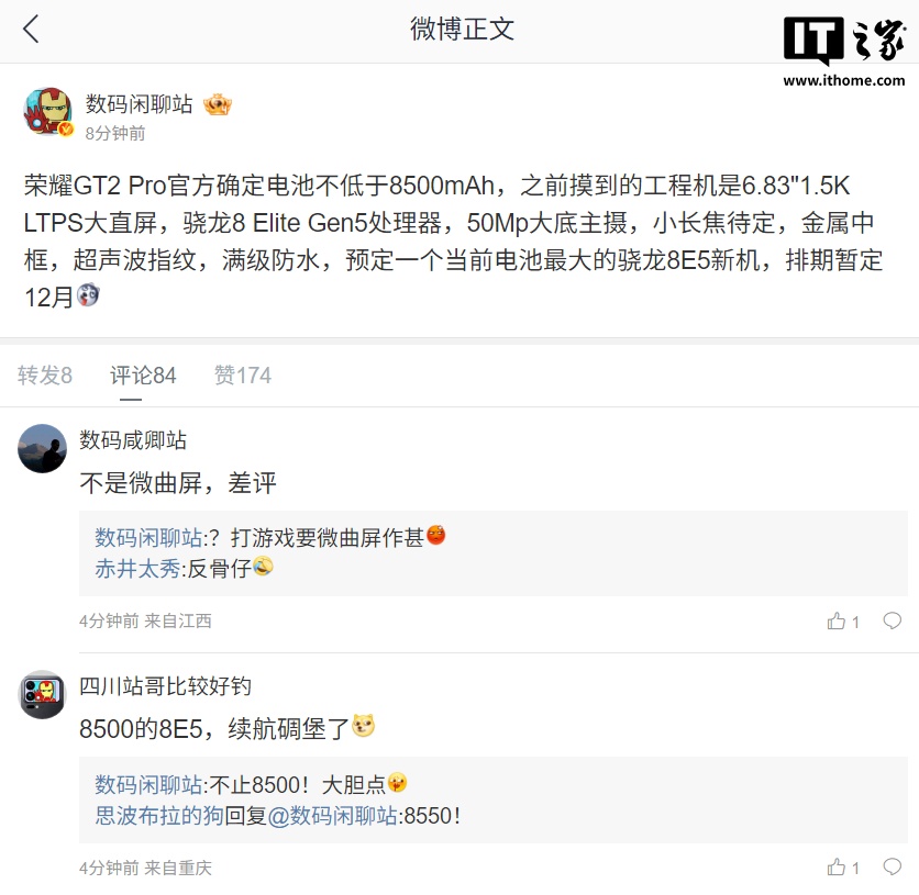 荣耀 GT2 Pro 官方确定电池不低于 8500mAh,之前摸到的工程机是 6.83"1.5K LTPS 大直屏,骁龙 8 Elite Gen5 处理器,50Mp 大底主摄,小长焦待定,金属中框,超声波指纹,满级防水,预定一个当前电池最大的骁龙 8E5 新机,排期暂定 12 月