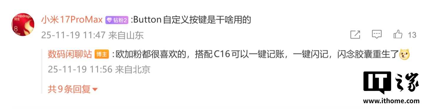 后续有用户在评论区表示:“那可以啊,苹果这个绿色和紫色都挺好看”,博主回复道:“我看很多人喜欢这个紫色,太骚了”;另一名用户则询问道:“Button 自定义按键是干啥用的”,博主回复道:“欧加粉都很喜欢的,搭配 C16 可以一键记账,一键闪记,闪念胶囊重生了”。