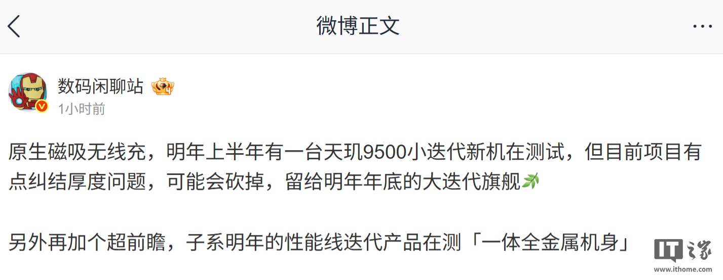 IT之家 11 月 19 日消息,博主 @数码闲聊站 今天在微博发文称,某厂的天玑 9500 芯片小迭代新机正在测试原生磁吸无线充。
