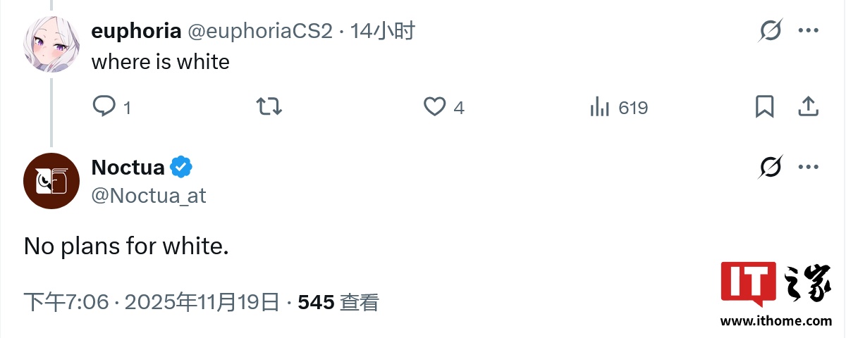 而 Noctua 官方在相关社交媒体动态下方回复网友时表示,没有推出“白化”产品的计划。