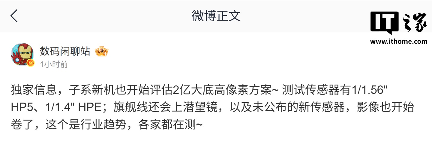 IT之家 11 月 20 日消息,博主 @数码闲聊站 今天在微博透露,某厂子系新机正在评估 2 亿大底高像素方案。