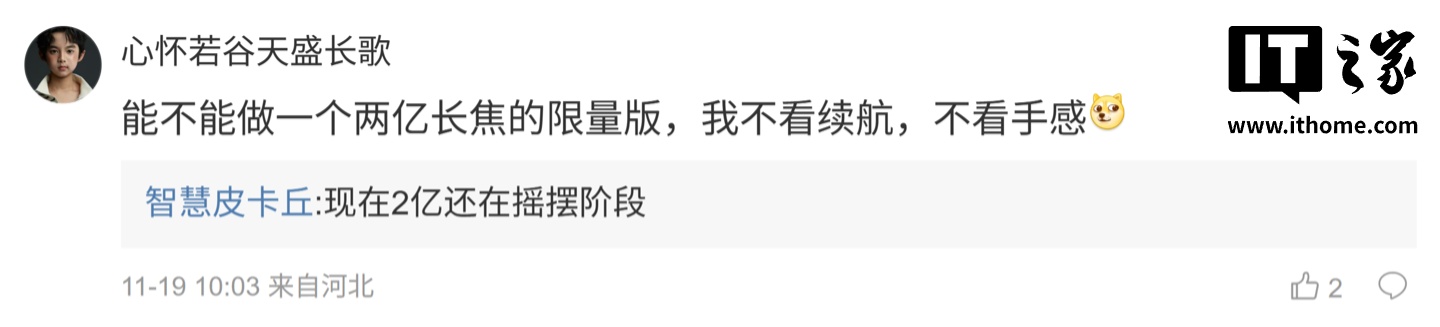 后续有用户在评论区询问:“能不能做一个两亿长焦的限量版,我不看续航,不看手感 ”,博主回复道:“现在 2 亿还在摇摆阶段”;另一名用户则回复道:“还在用次旗舰处理器”,博主则回复道:“