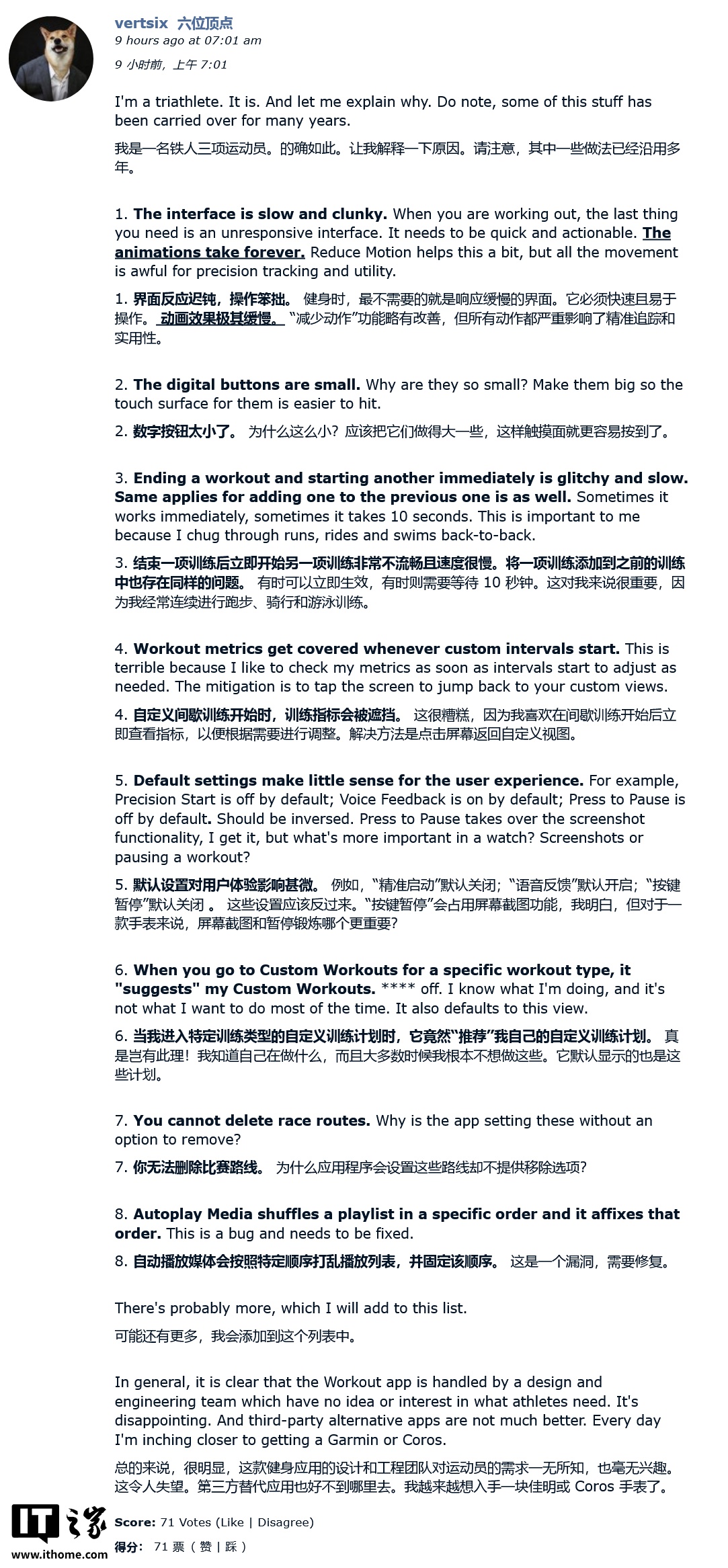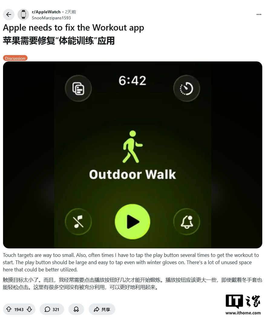该媒体调查后还发现用户的负面反馈集中在多个具体痛点上。首先是触摸目标过小,许多用户抱怨需要反复点击才能成功启动锻炼。这个问题在游泳等湿手场景下被急剧放大,多位游泳爱好者称,一旦入水或在运动中途,几乎不可能可靠地开始或切换训练。其次,新布局改变了目标设置、快速开始等常用功能的位置,严重破坏了老用户长年累月形成的“肌肉记忆”。