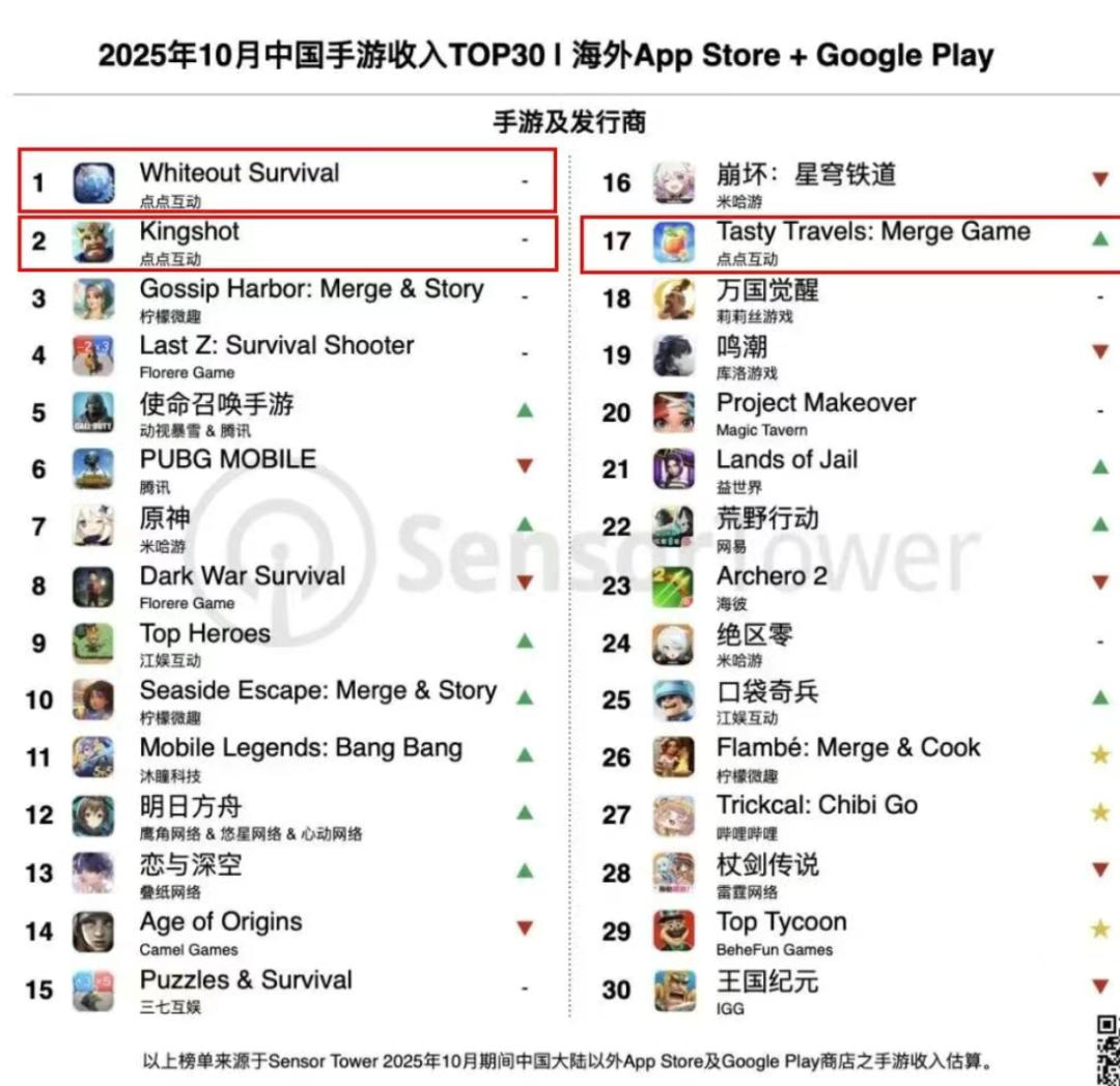 Sensor Tower发布的2025年10月中国手游产品在海外市场收入排行TOP30显示,点点互动《Whiteout Survival》(无尽冬日)和《Kingshot》(奔奔王国)继续包揽出海手游收入榜冠亚军。《Tasty Travels: Merge Game》收入再度提升15%,排名则是提升2位来到第17名。