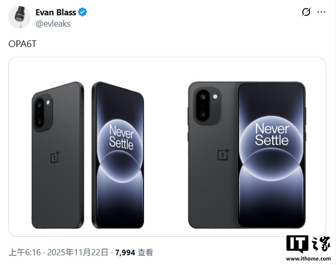 IT之家 11 月 22 日消息,消息源 @Evleaks 今天(11 月 22 日)在 X 平台发布推文,分享了两张照片,展示了一加 Ace 6T 手机完整正反面设计。