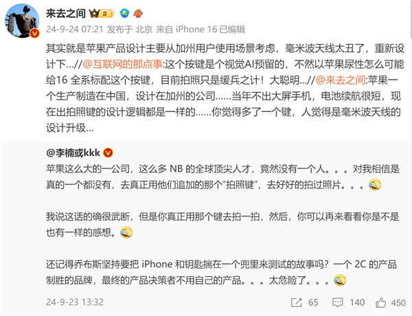 随后,微博CEO也开始对苹果补刀吐槽:“苹果一个生产制造在中国,设计在加州的公司……当年不出大屏手机,电池续航很短,现在出拍照键的设计逻辑都是一样的……你觉得多了一个键,人觉得是毫米波天线的设计升级…”。