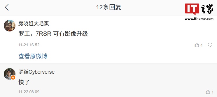 IT之家注意到,有用户留言 Magic7 RSR 保时捷设计手机是否会有影像升级,罗巍回复“快了。”这表明,Magic7 RSR 将在近期开启新版本升级,并提升影像能力。