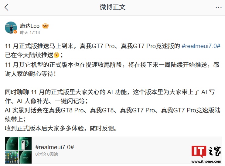 realme UI 产品经理 @康达Leo 透露,11 月其它机型的正式版本也在提速收尾阶段,将在接下来一周陆续开始推送。新版本将带来 AI 写作、AI 人像补光、一键闪记等功能;AI 实景对话会在真我 GT8 Pro、真我 GT8、真我 GT7 Pro、真我 GT7 Pro 竞速版陆续上线。