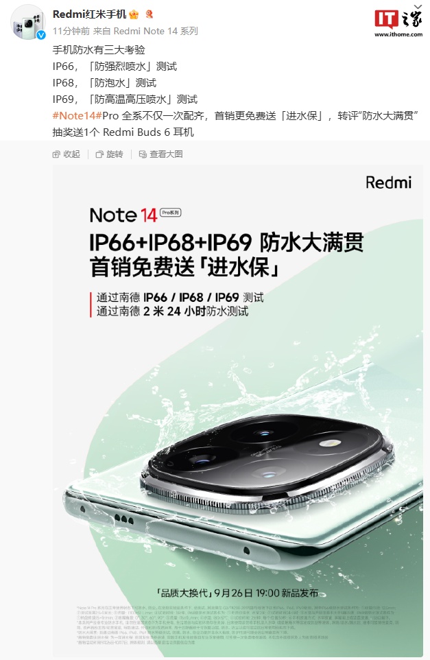 IT之家 9 月 23 日消息,小米手机今日宣布,Redmi Note14 Pro 系列通过 IP66 防强烈喷水测试、IP68 防泡水测试、IP69 防高温高压喷水测试,首销免费送“进水保”。