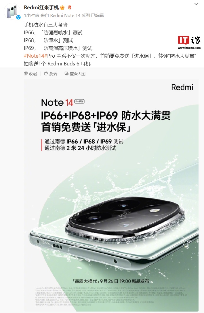 IT之家 9 月 23 日消息,小米今日官宣,Redmi Note14 Pro 系列手机通过南德 IP66 / IP68 / IP69 测试和南德 2 米 24 小时防水测试,首销免费送“进水保”。