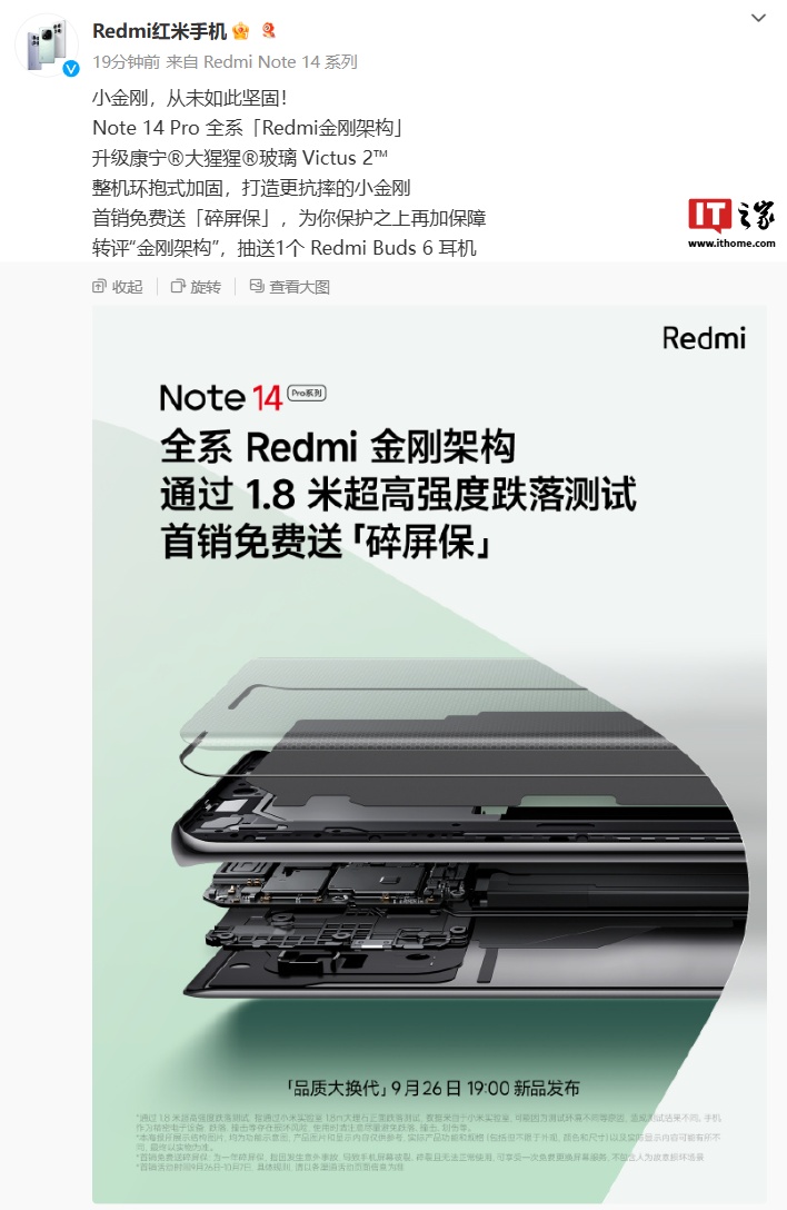 小米官方今日再次发文预热,Redmi Note14 Pro 系列手机升级康宁大猩猩玻璃 Victus 2,全系 Redmi 金刚架构,通过 1.8 米超高强度跌落测试,首销免费送“碎屏保”。