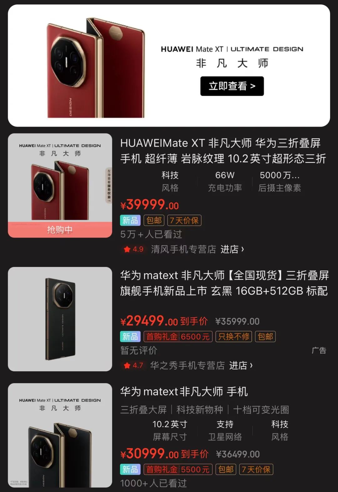截至发稿时,华为Mate XT实际成交价普遍已跌破3万元。与之相应,一度被炒到2-3万元的三折叠优购码,也渐渐降温至8000-9000元区间。