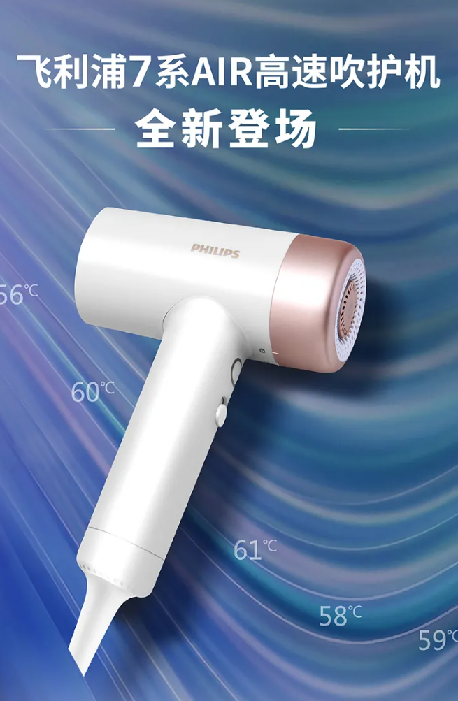 飞利浦 7 系 Air 高速吹护机是一款吹风机产品,搭载全新“智能温润”模式,支持 150 次 / 秒控温,智能恒温 60℃。