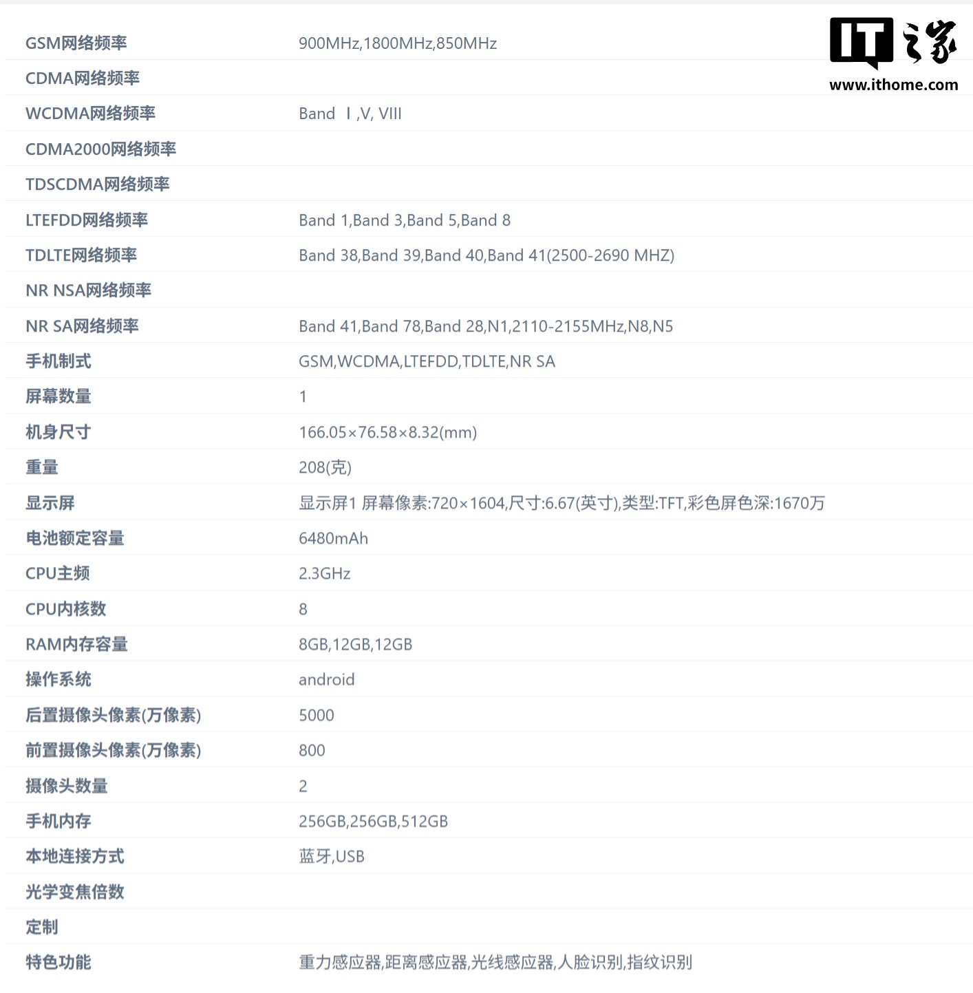 IT之家查询电信设备终端网发现,这款手机由唯科终端技术(东莞)有限公司生产,配备 8 核心处理器,CPU 主频可达 2.3GHz,屏幕分辨率为 720*1604(720P),支持 NR SA、TD-LTE、WCDMA 等通信制式。