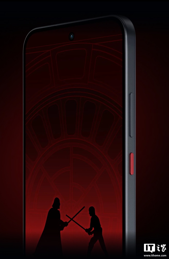 据介绍,这款手机最大的亮点就是遍布《星球大战》设计,机身整体采用暗黑设计,背部带有达斯・维德头盔图案、死星标志和品牌 Logo,机身边框采用深灰色调,电源键带有醒目的红色点缀。