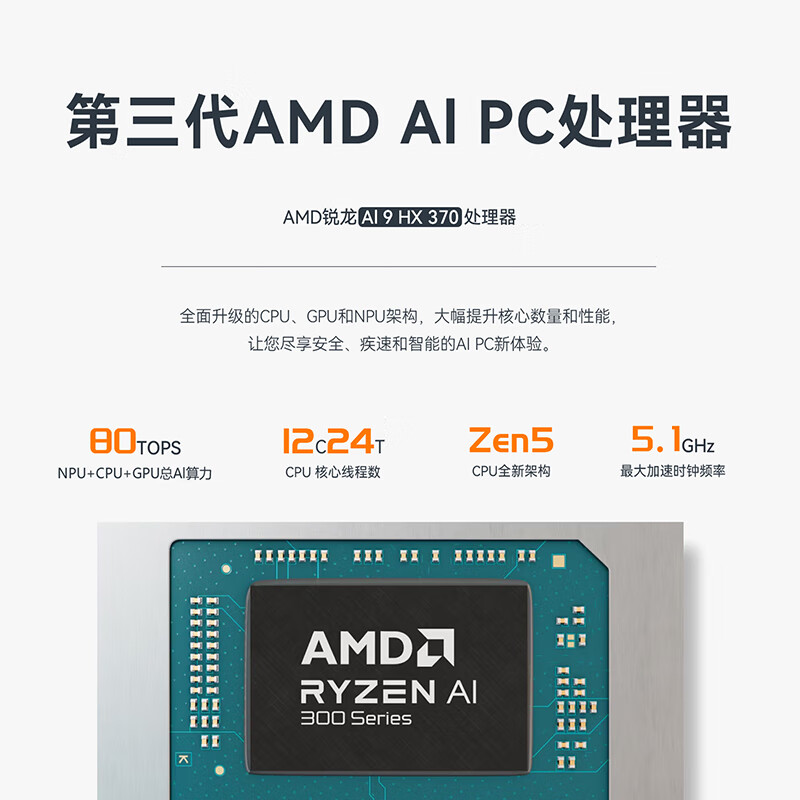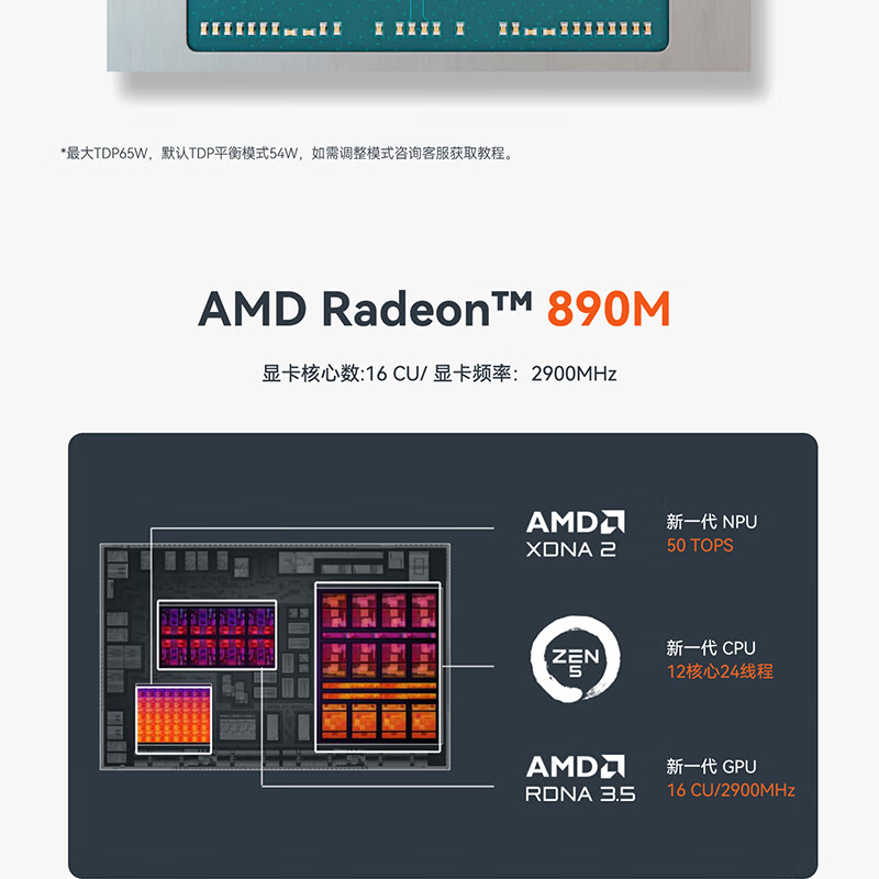 SER9 搭载 AMD 锐龙 AI 9 HX 370 处理器,12 核心 24 线程,总 AI 算力 80 TOPS,最大 TDP 65W(默认平衡模式 54W)。